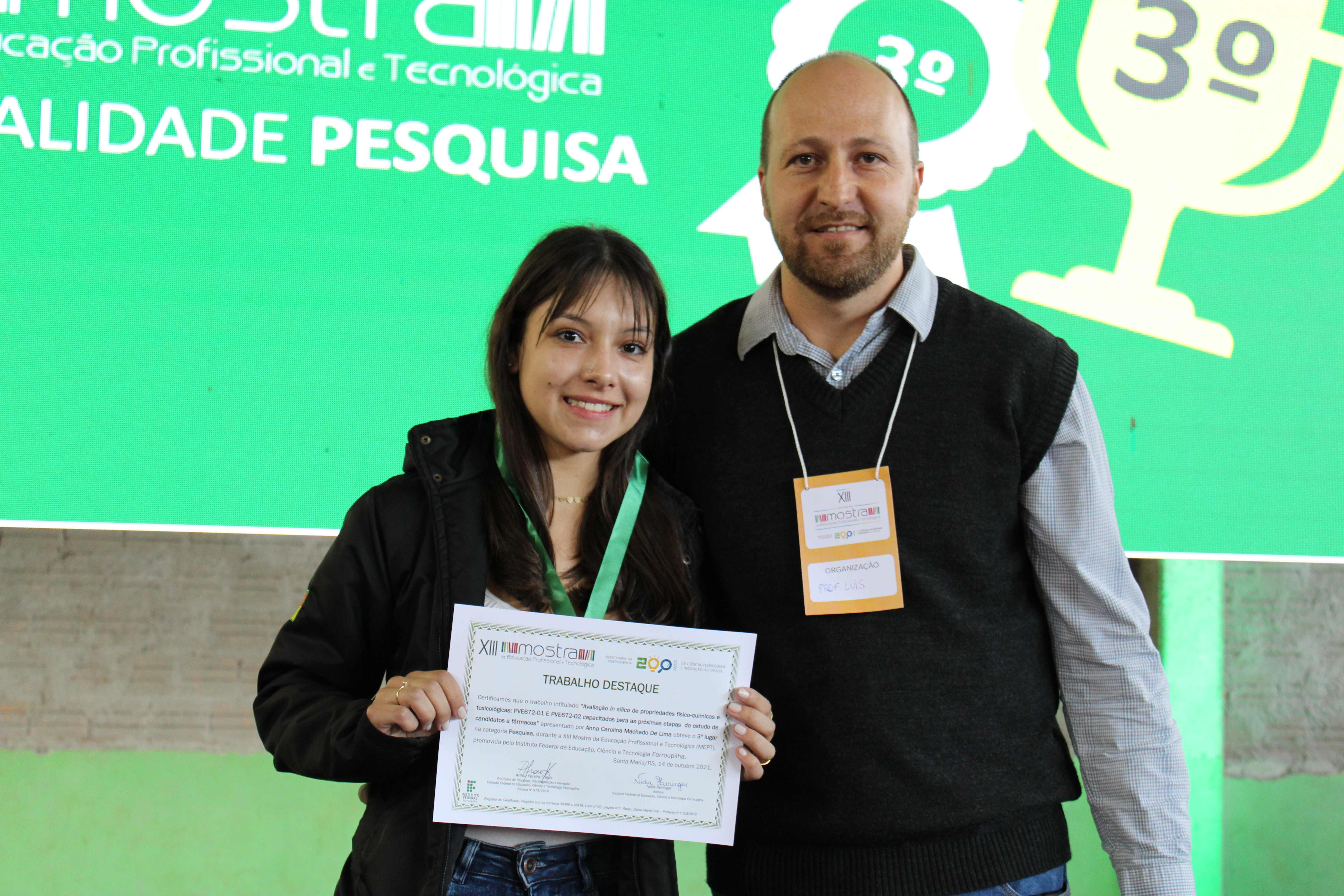 - 3º lugar – Anna Carolina Machado de Lima – Campus Júlio de Castilhos. Título do trabalho: Avaliação in sílico de propriedades físico-químicas e toxicológicas: PVE672-01 e PVE672-02 capacitados para as próximas etapas do estudo de candidatos a fármacos.
