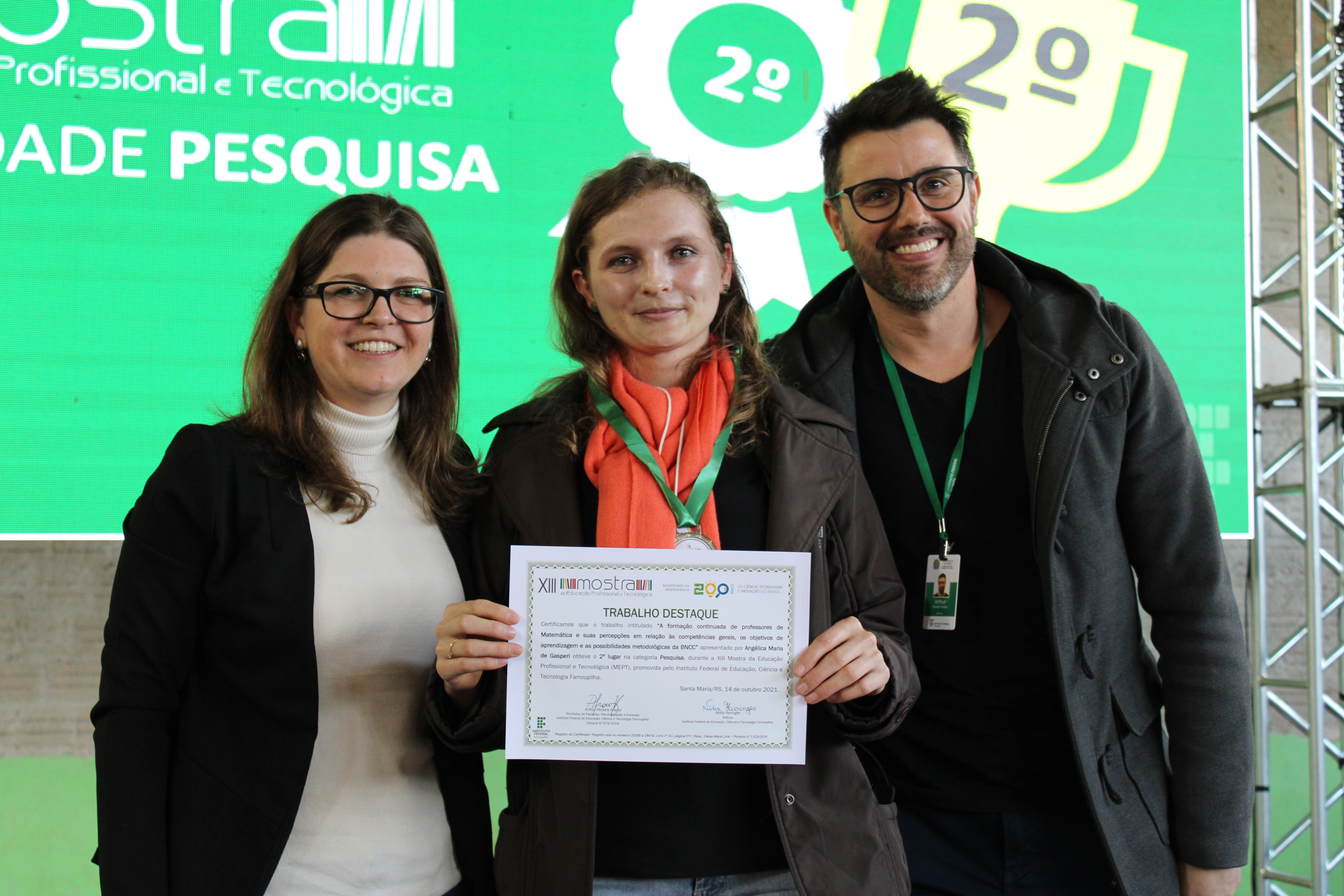 - 2º lugar – Angélica Maria de Gasperi – Campus Santa Rosa. Título do trabalho: A formação continuada de professores em Matemática e suas percepções em relação às competências gerais, os objetivos de aprendizagem e as possibilidades metodológicas da BNCC.