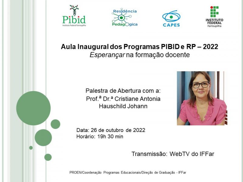 O IFFar promove a aula inaugural dos Programas Pibid e RP - 2022 nesta quarta-feira (26), às 19h30. A atividade será transmitida pela WebTV do IFFar.
