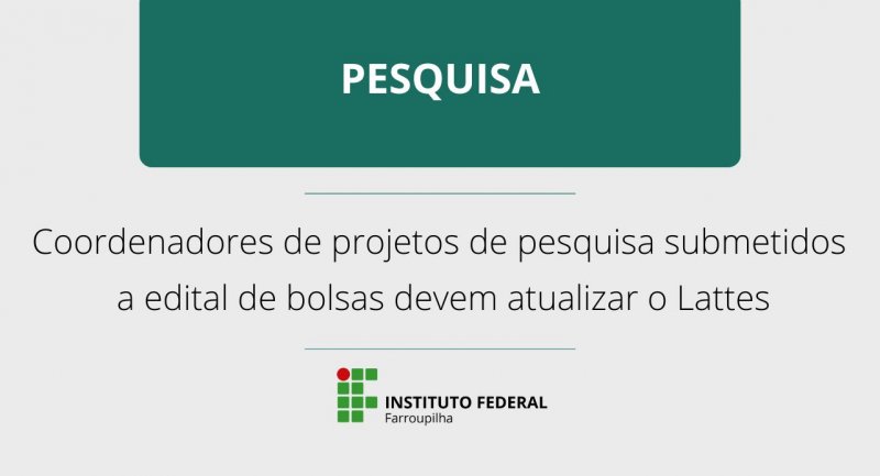 Os servidores ou servidoras que submeteram ou pretendem submeter propostas ao Edital nº 013/2023 precisam estar com o currículo publicado e atualizado na plataforma Lattes do CNPq até o dia 30 de março. O edital rege a seleção para cadastro e ranqueamento de projetos para o programa de bolsas de iniciação científica e tecnológica do IFFar.