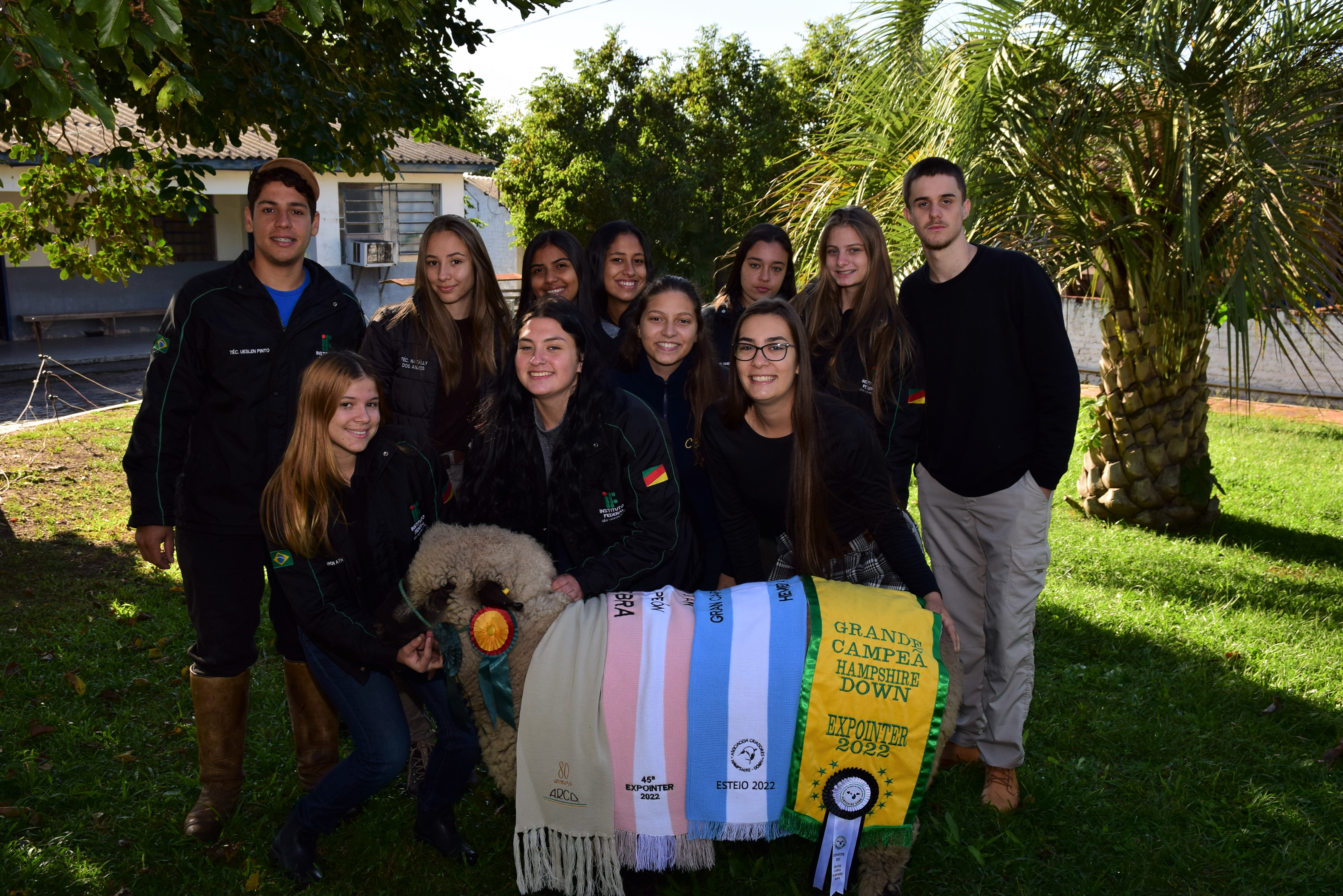 Estudantes do Técnico em Agropecuária posam com ovelha premiada na Expointer 2022