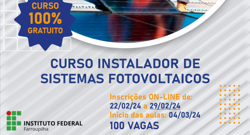 O Instituto Federal Farroupilha oferece 100 vagas para o curso presencial de Instalador de Sistemas Fotovoltaicos. As inscrições terminam nesta quinta-feira (29). Para participar, é necessário ter o 5º ano do ensino fundamental completo.