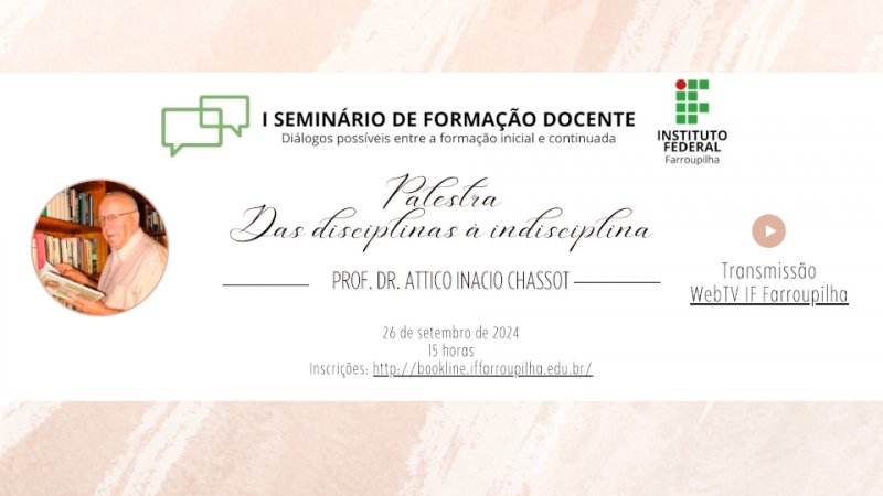 A palestra “Das disciplinas à indisciplina”, ministrada pelo professor Attico Inacio Chassot, ocorre no dia 26 de setembro, a partir das 15h. A atividade faz parte do 1º Seminário de Formação Docente e terá transmissão da WebTV do IFFar.