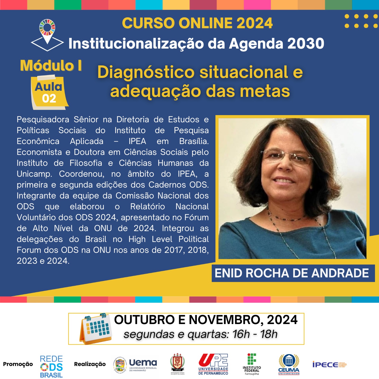 Professora: Enid Rocha de Andrade. É economista e doutora em Ciências Sociais pela Universidade Estadual de Campinas (Unicamp). Atualmente é pesquisadora sênior na Diretoria de Estudos e Políticas Sociais do Instituto de Pesquisa Econômica e Aplicada (Ipea), em Brasília. No Ipea, coordenou as primeiras edições dos Cadernos ODS.