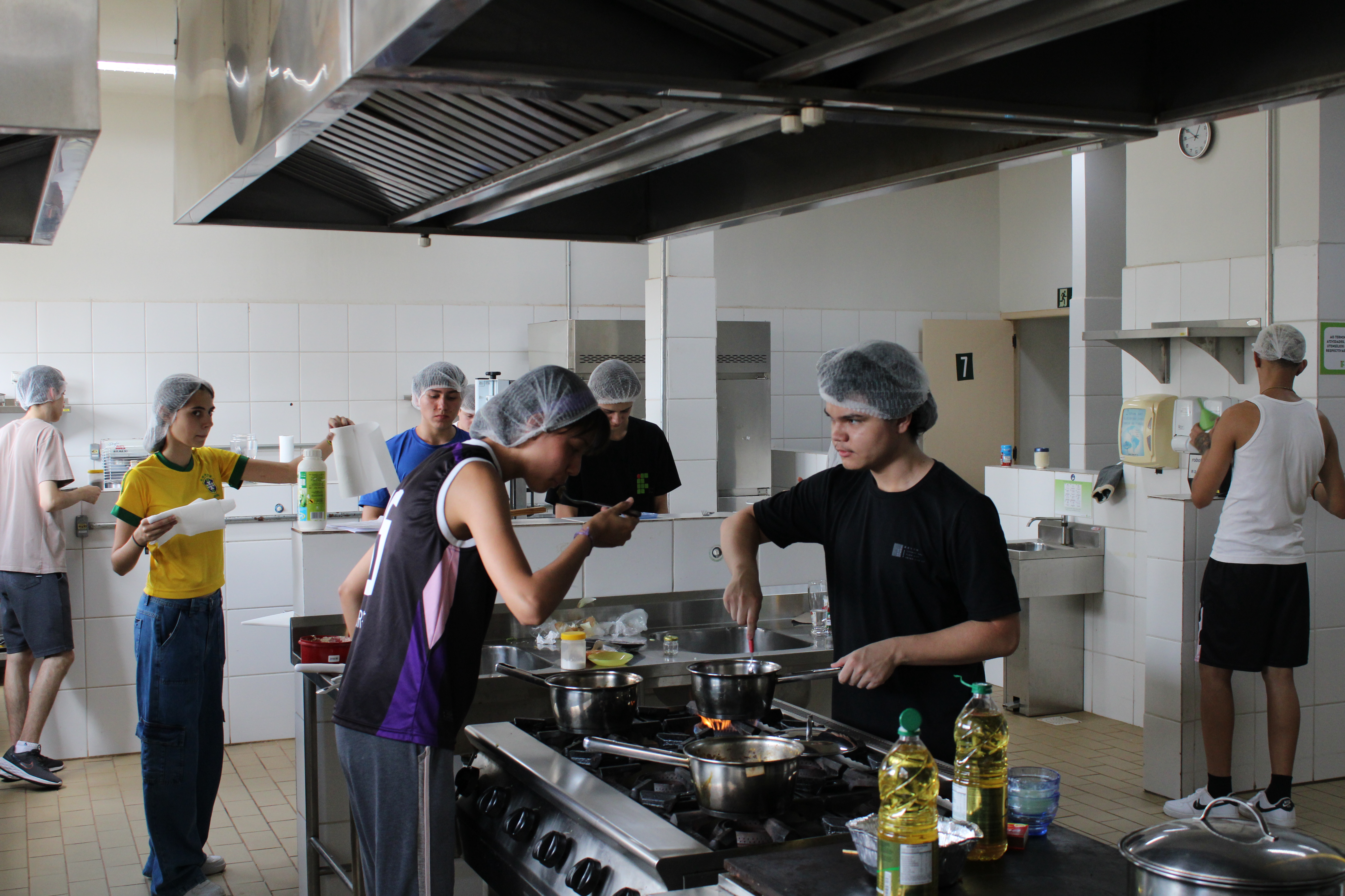 Muitos dos estudantes nunca haviam tido contato com um laboratório de Gastronomia ou mesmo com os utensílios e equipamentos profissionais de uma cozinha. Por isso, a participação da professora Juliana Félix, do curso de Gastronomia, foi essencial para o bom andamento da atividade. Coube a ela supervisionar o manuseio correto dos materiais, orientar sobre segurança alimentar e garantir que cada grupo pudesse executar suas receitas com autonomia — mas também com responsabilidade.