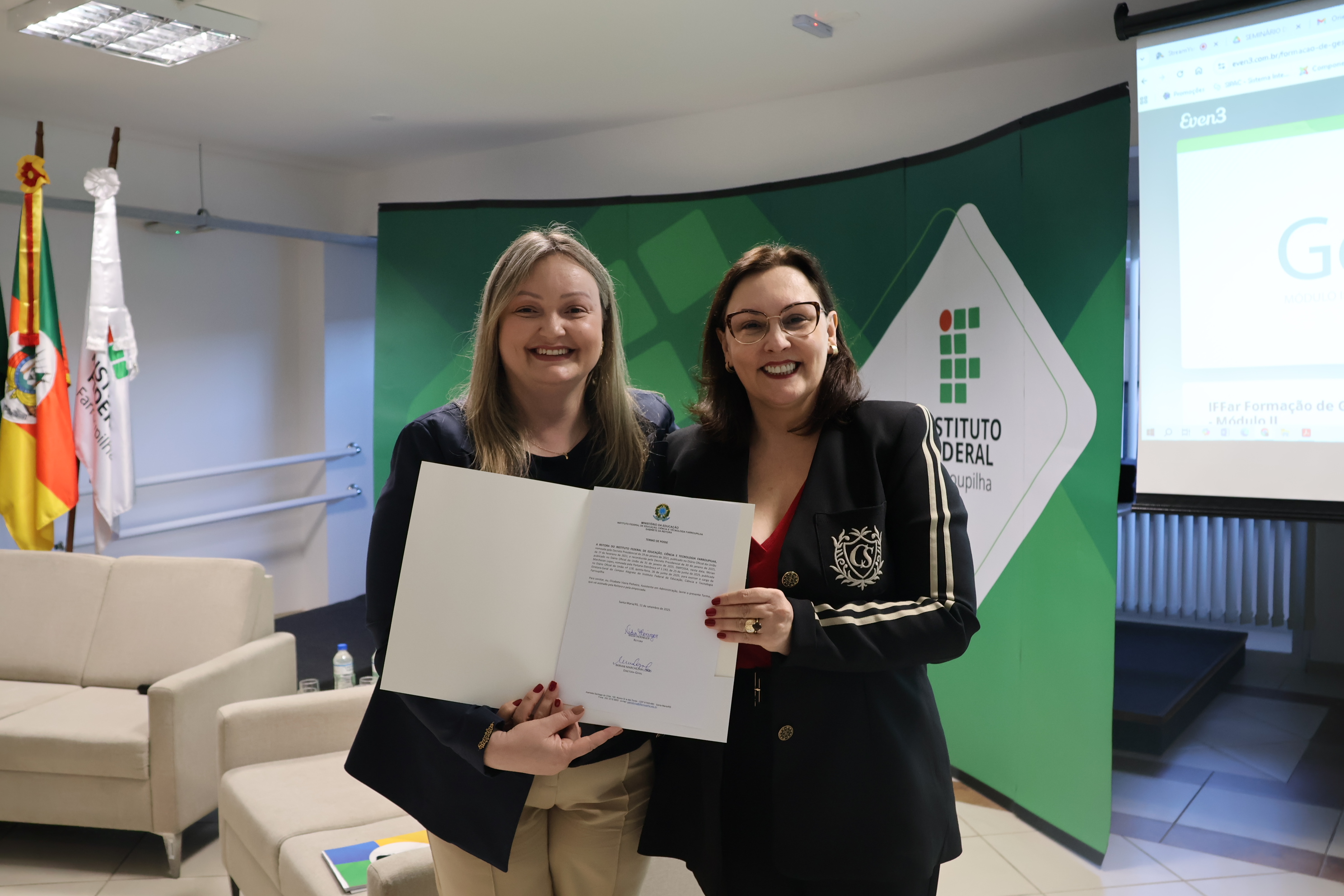 Com a reitora oficialmente reconduzida ao cargo, o IFFar realizou nesta quinta-feira (11), a cerimônia oficial de posse dos diretores e diretoras-gerais eleitas em 2024. A solenidade marcou o início da programação da segunda parte do Curso de Formação de Gestores do IFFar.