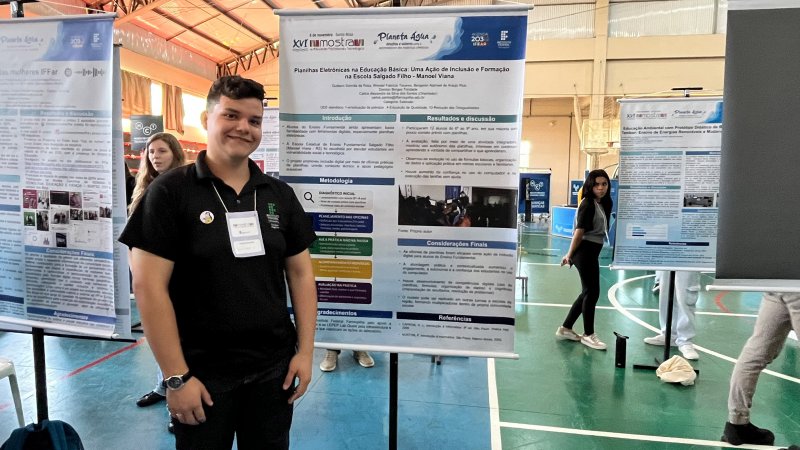 Outro exemplo de extensão transformadora vem do Campus Alegrete. Gustavo Schmitz da Rosa, aluno do curso Técnico em Informática integrado ao Ensino Médio, apresentou o projeto “Planilhas Eletrônicas na Educação Básica”, desenvolvido em parceria com a Escola Salgado Filho, em Manoel Viana. A proposta surgiu da necessidade de promover inclusão digital entre estudantes do 6º ao 9º ano que nunca haviam utilizado um computador.