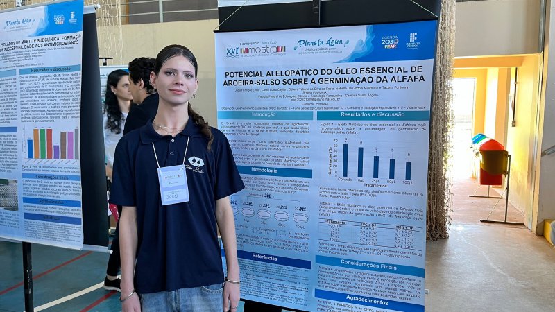 João Henrique Ledur, estudante do curso Técnico de Administração integrado ao ensino médio do Campus Santo Ângelo, apresentou uma pesquisa sobre o potencial alelopático do óleo essencial de aroeira-salso na germinação da alfafa. Preocupado com os altos índices de uso de agrotóxicos no país, o estudante buscou na pesquisa alternativas sustentáveis a partir da ação de compostos naturais. “Investigamos a aplicação do óleo em diferentes concentrações sobre sementes de alfafa durante cinco dias, avaliando taxa de germinação, velocidade e tempo médio de germinação”, explica.