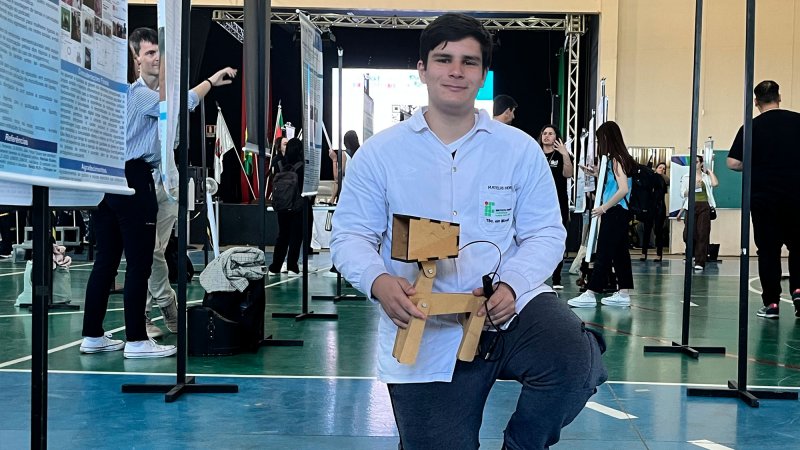 A mostra também evidenciou como a extensão universitária pode gerar impacto direto na comunidade. Uma das ações extensionistas apresentadas na Mept foi pelo estudante Mateus Henrique de Moura Horn, do curso Técnico em Marcenaria integrado ao Ensino Médio do Campus Santa Rosa, é um dos extensionistas do projeto “Espaço Mão na Massa: marcenaria para todos”, que oferece oficinas abertas à população durante eventos institucionais.