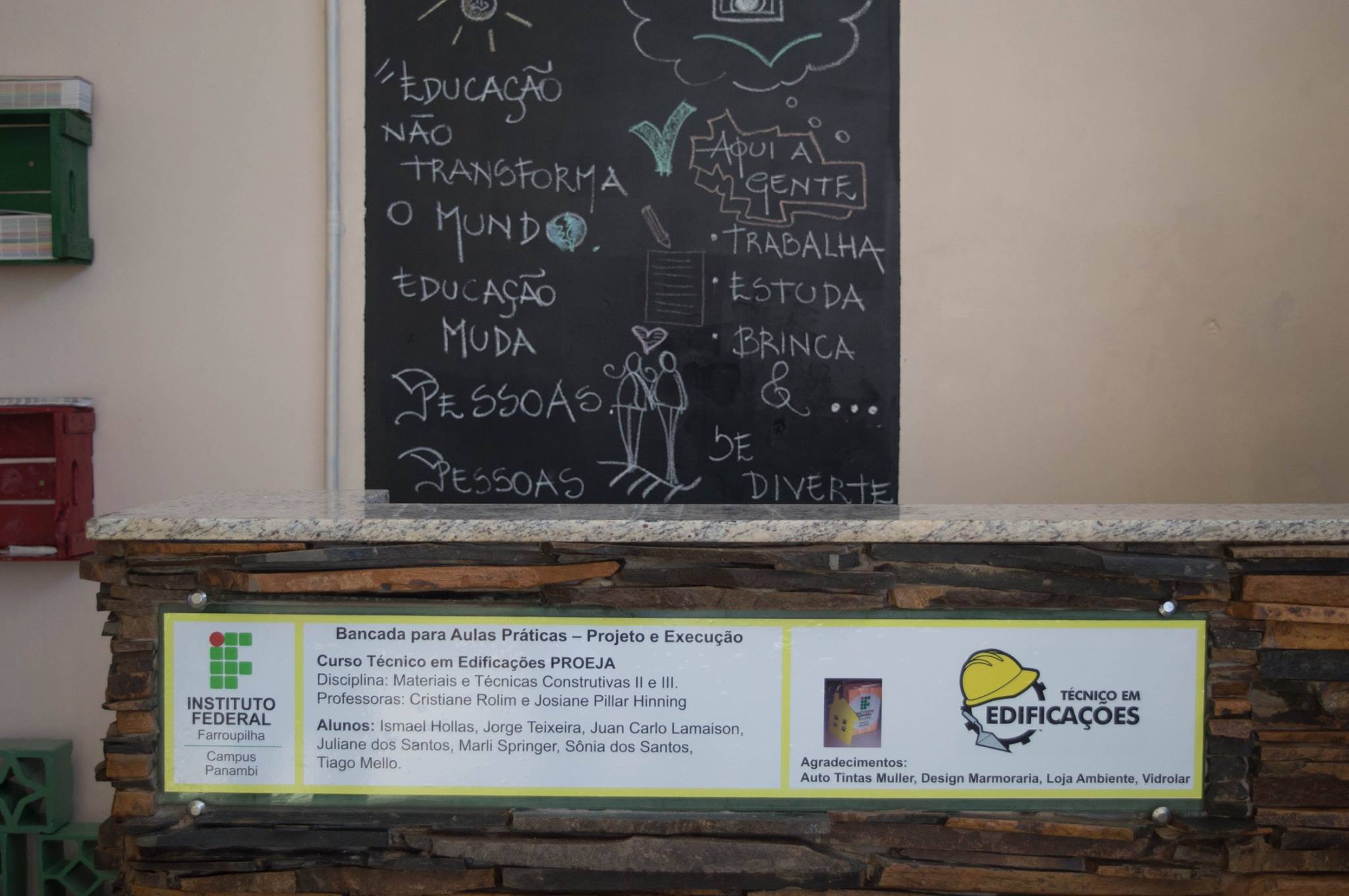 Na primeira etapa do projeto, foi construída uma bancada para aulas práticas com apoio e doação de materiais de acabamentos. Atualmente, está em fase de desenvolvimento o cadastro de empresas e autônomos que atuam na construção civil, o qual será socializado com a comunidade externa por meio de um portal. Com previsão de conclusão em 2018, o projeto conta com o apoio do IF Farroupilha para o seu desenvolvimento.