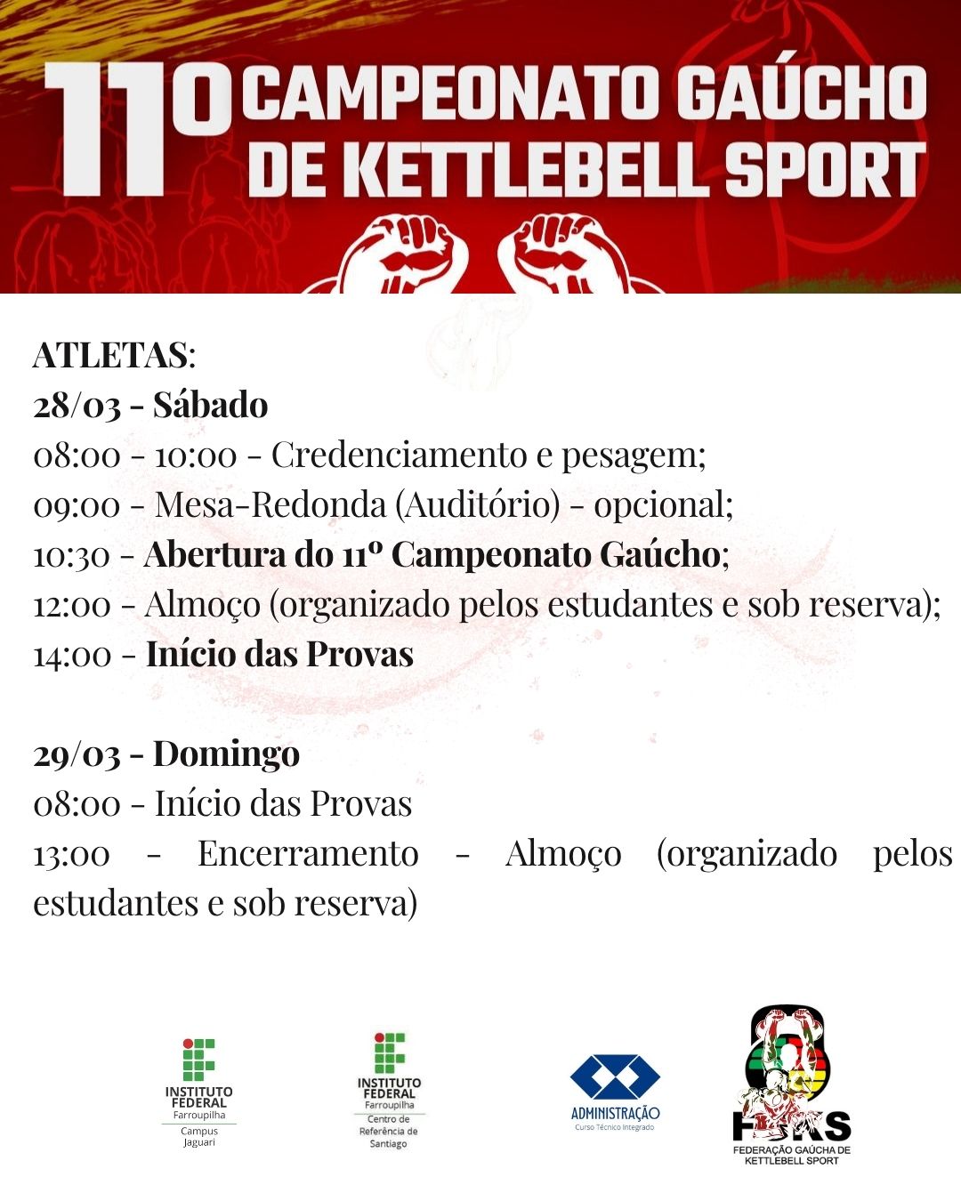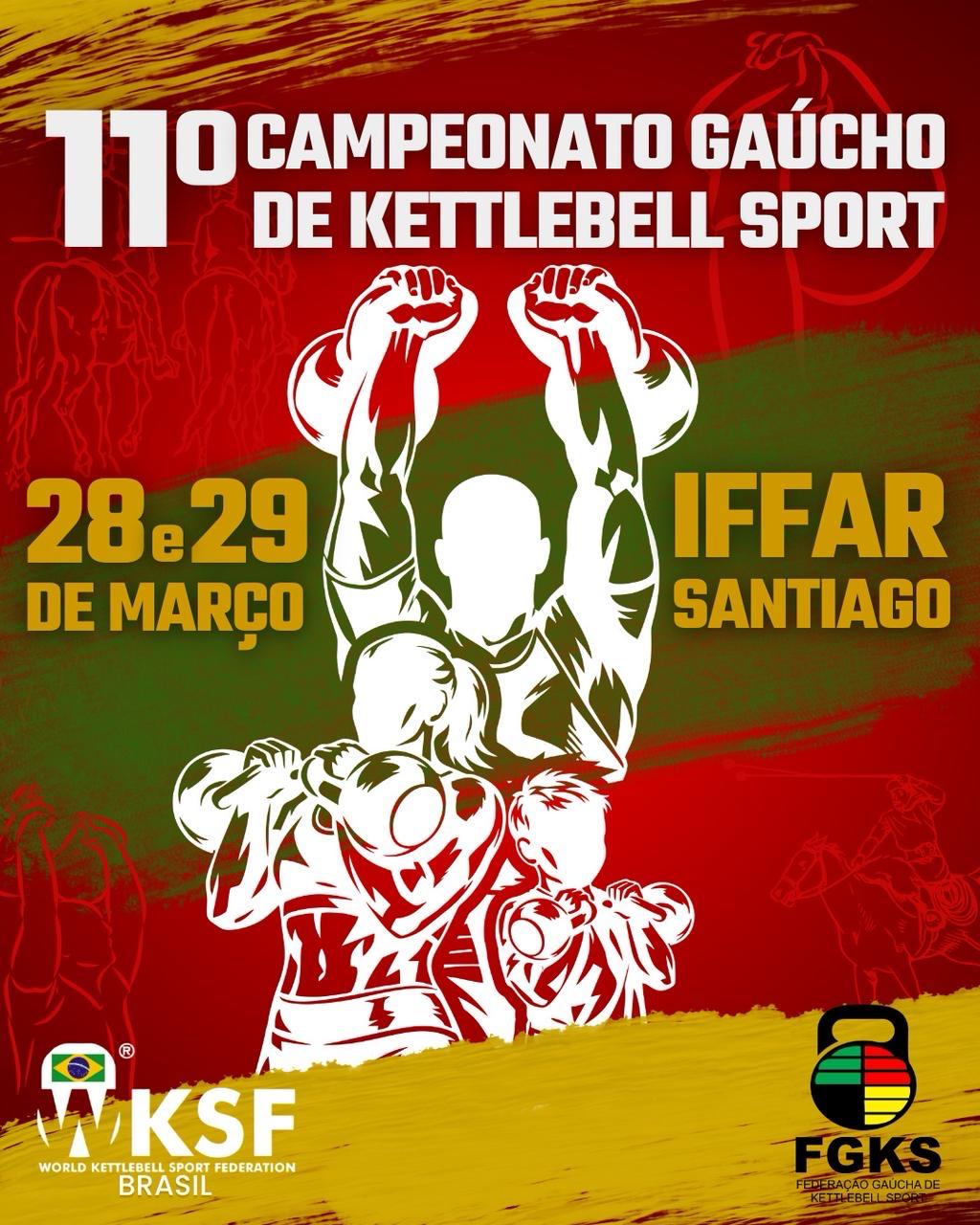 O 11º Campeonato Gaúcho de Kettlebell Sport acontece nos dias 28 e 29 de março no Centro de Referência do IFFar em Santiago. O evento promove a integração entre atletas, estudantes, famílias e comunidade em geral, além de divulgar e incentivar o crescimento da modalidade no Rio Grande do Sul.