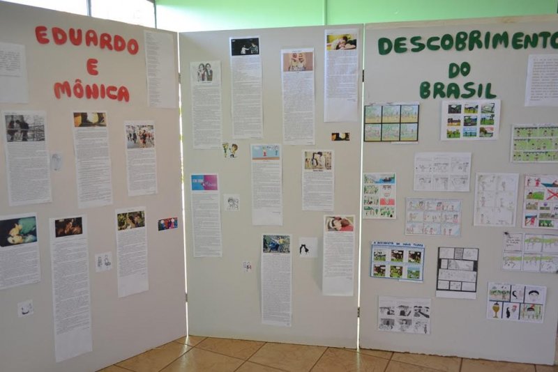 Os trabalhos sobre a música Eduardo e Mônica e as Histórias em Quadrinhos sobre o descobrimento do Brasil estão expostos em um painel no hall de entrada do campus.