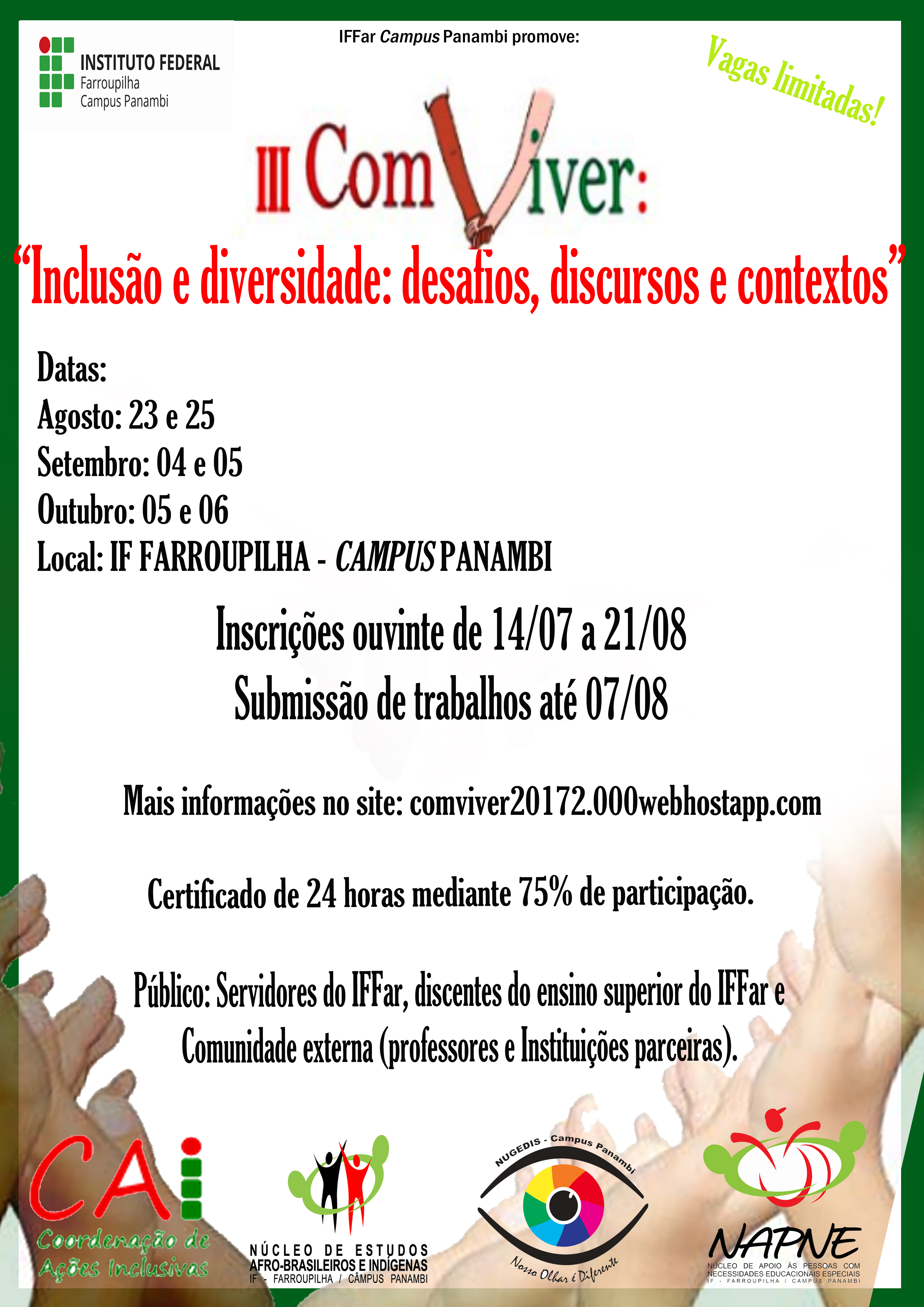 Informações complementares sobre o evento podem ser obtidas em comviver20172.000webhostapp.com/ e as inscrições devem ser realizadas via e-mail Este endereço de email está sendo protegido de spambots. Você precisa do JavaScript ativado para vê-lo.. O prazo para inscrição de trabalhos encerra-se no dia 7 de agosto e as inscrições para ouvintes vão até o dia 21 de agosto.