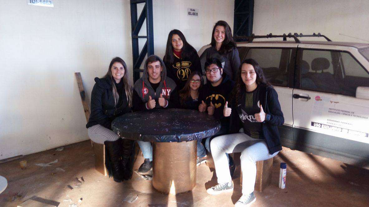 A turma foi dividida em sete equipes, sendo que cada uma ficou responsável pela construção de um banco, pufe ou plataforma, que comportasse no mínimo seis pessoas, para uso coletivo em áreas de lazer, a serem instalados na instituição para serem utilizados por alunos e servidores.