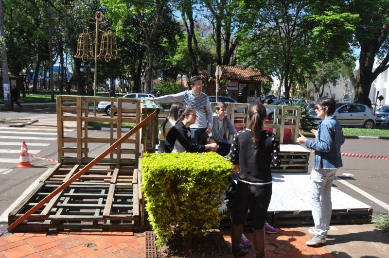 Foto: alunos e professores fazem montagem do Parklet na manhã de segunda-feira (18)
