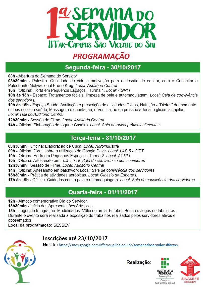 O Instituto Federal Farroupilha – Campus São Vicente do Sul vai promover atividades alusivas ao Dia do Servidor nos dias 30, 31 e 1º de novembro. A programação conta atividades variadas que vão desde palestras sobre o trabalho até oficinas de artesanato.
