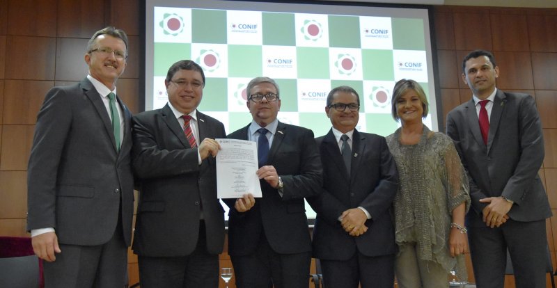 Foto: nova diretoria do Conif posa para foto. O novo presidente do Conif, Roberto Gil Rodrigues Almeida, é o terceiro da esquerda para a direita