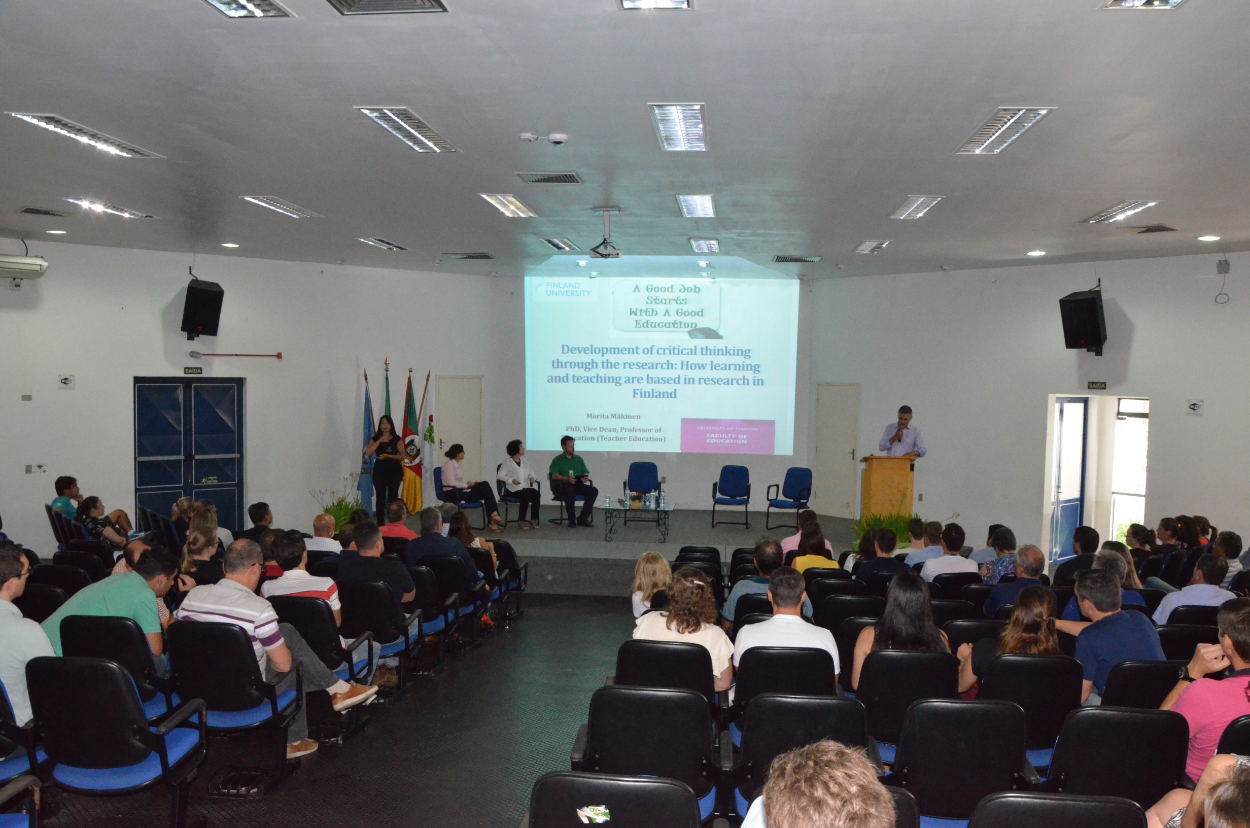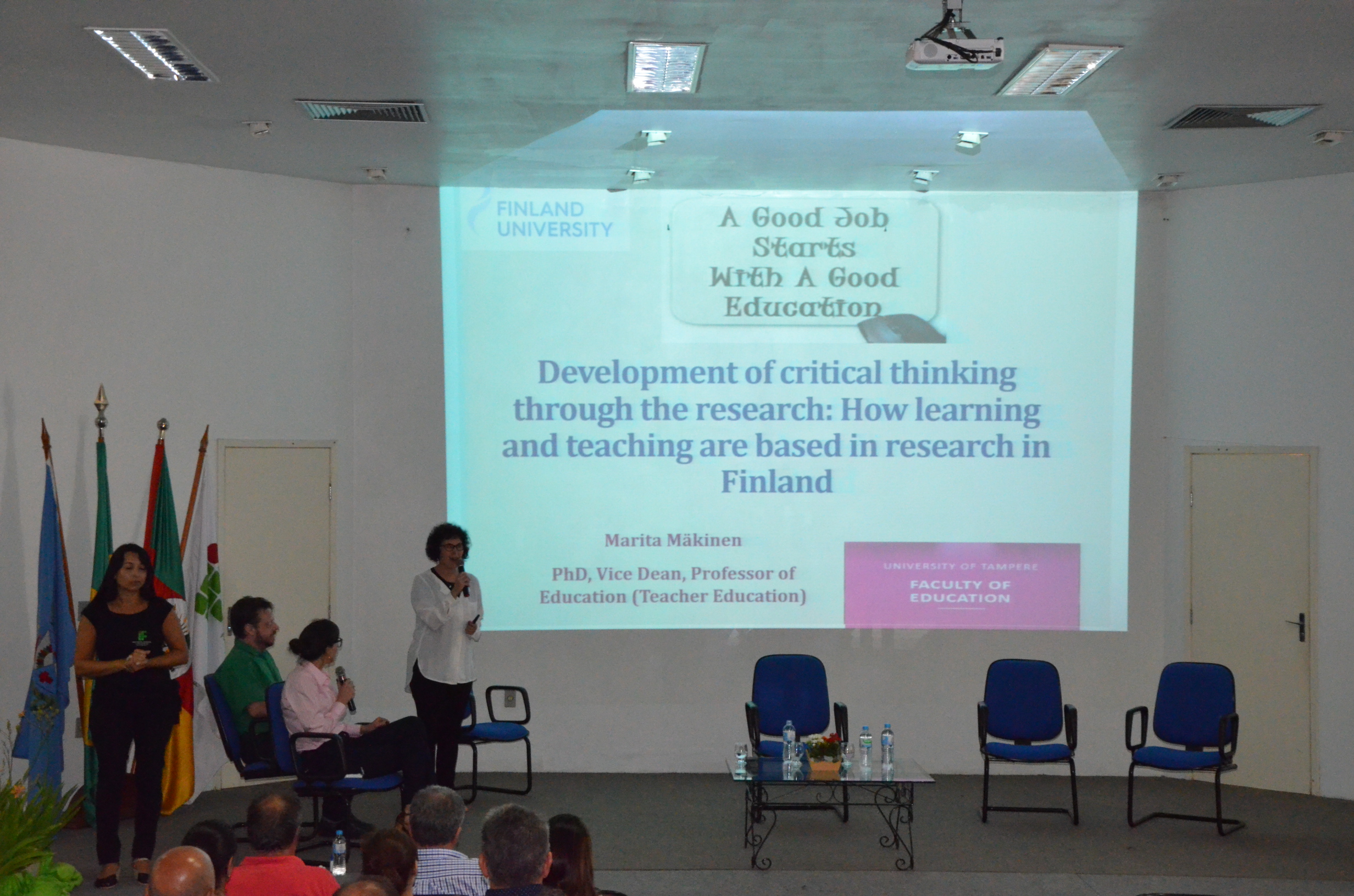 Na parte da tarde, foi realizada a palestra “Development of critical thinking through the research-teaching nexus: How research has based the whole process of teaching / learning in Finland” sobre o papel da pesquisa no desenvolvimento do pensamento crítico durante o processo de ensino-aprendizagem na Finlândia. Assista à palestra no canal da WebTV do IFFar no YouTube.