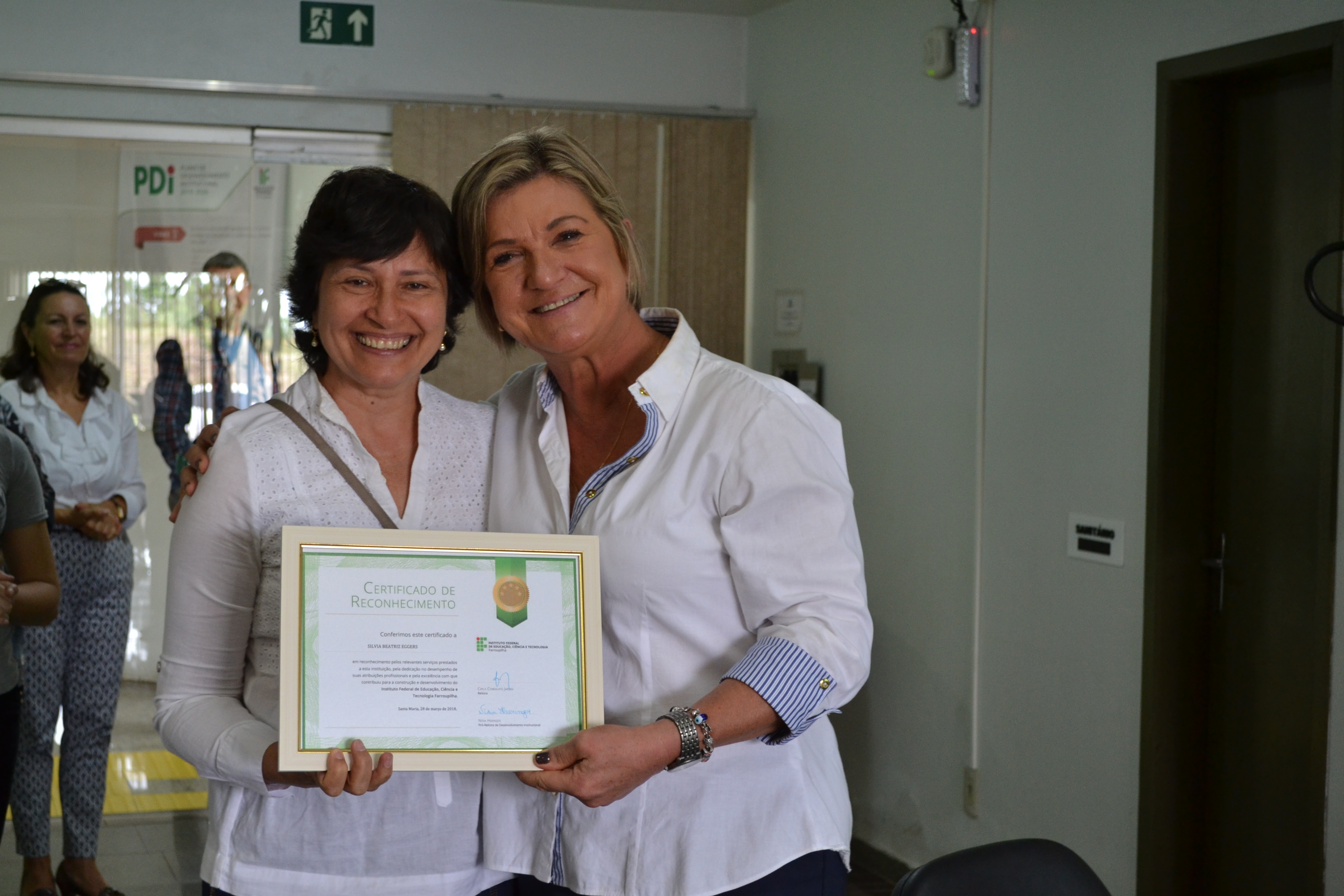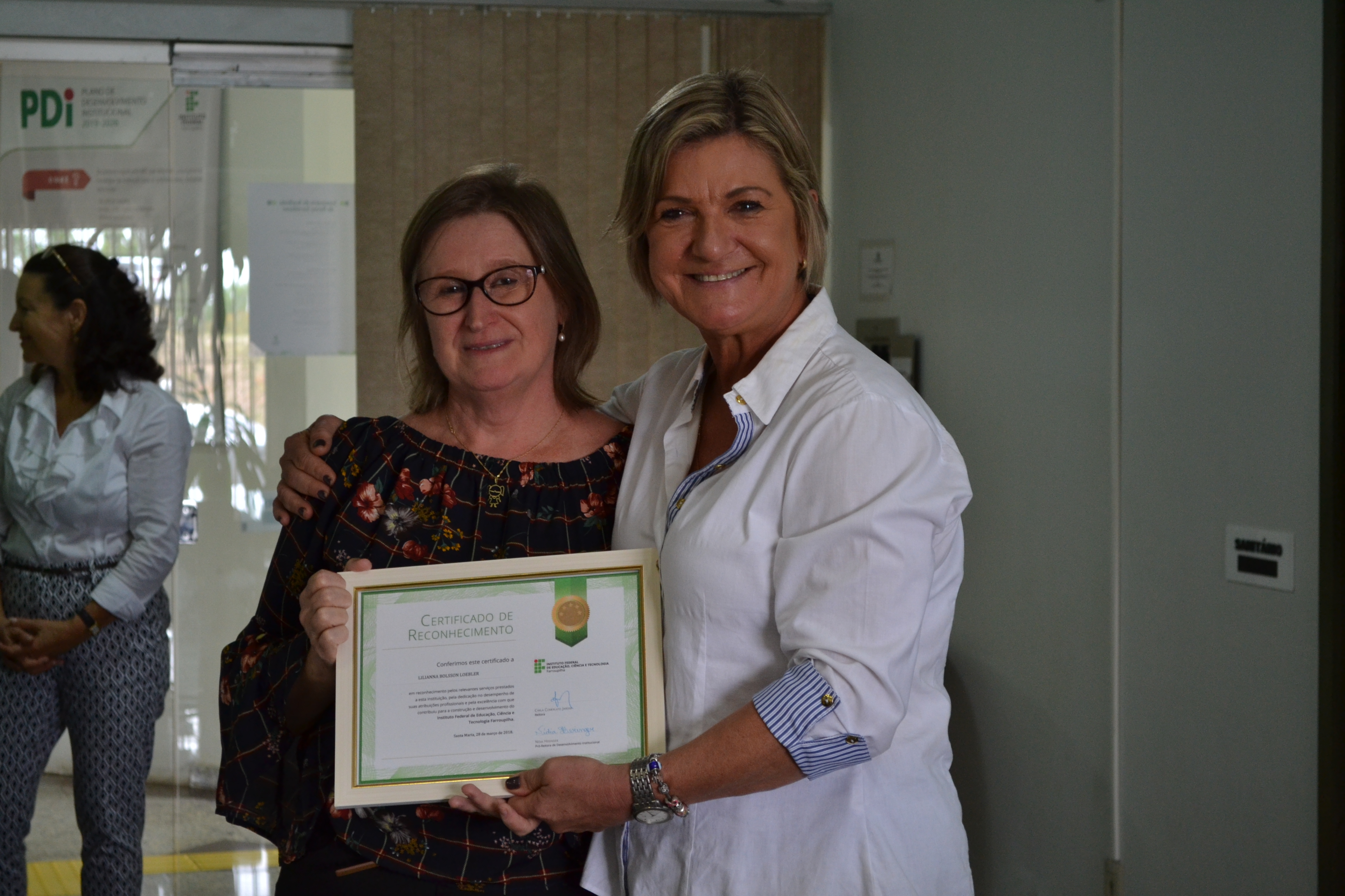 Em seguida, houve um momento de homenagem a duas servidoras que se aposentaram recentemente na instituição. Silvia Beatriz Eggers se aposentou em 29 de setembro do ano passado, tendo exercido suas atividades como servidora técnica-administrativa em educação, e Lilianna Bolsson Loebler se aposentou em 19 de março deste ano como docente. A Reitora fez a entrega de um certificado de reconhecimento aos serviços prestados às duas servidoras, destacando a trajetória de cada uma na instituição e agradecendo o empenho com que desempenharam suas funções.